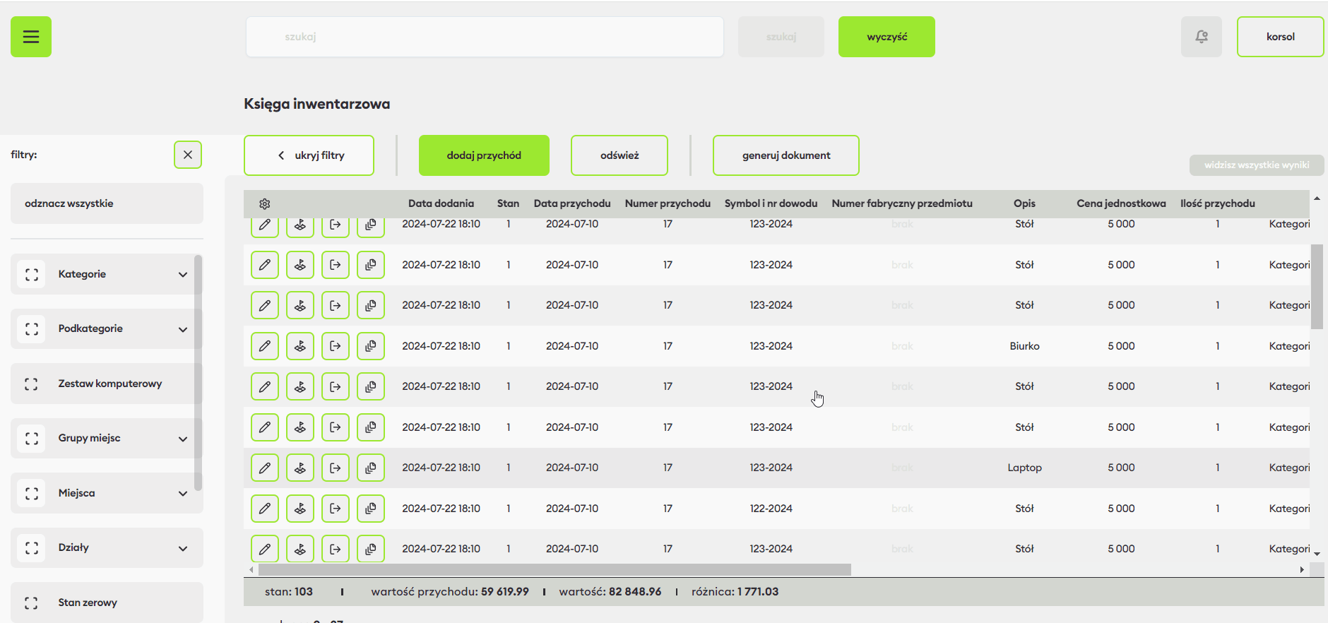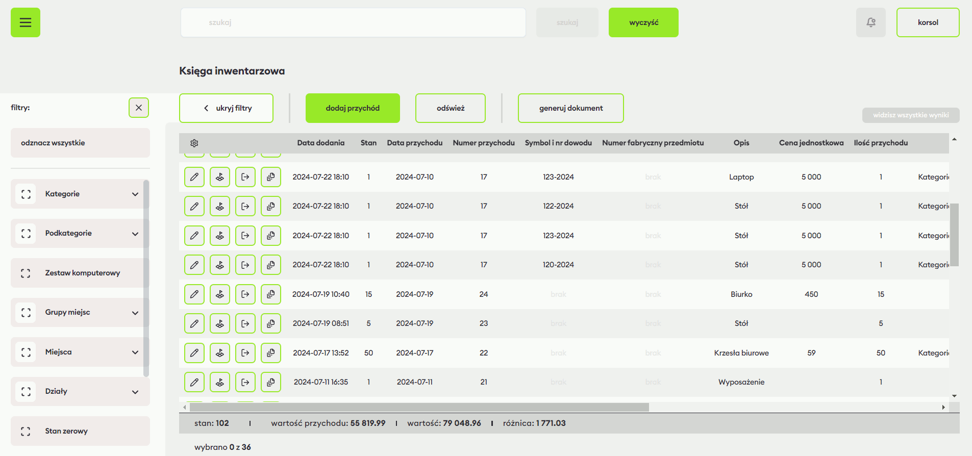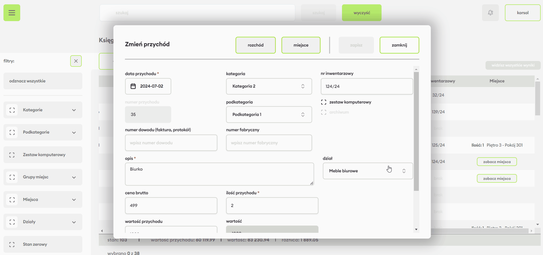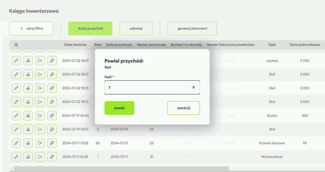 Nowa pozycja wyświetla się u szczytu listy w Księdze inwentarzowej. Dostępne są przyciski, dzięki którym bezpośrednio przejdziesz do wybranych czynności: edytuj przychód, zobacz historię miejsc, rozchód i powiel przychód. Do edycji możesz również przejść, podwójnie klikając wybraną pozycję w księdze. W oknie edycji można także dodać rozchód lub nowe miejsce.